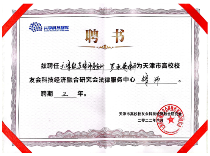 我所副主任罗承菊律师被聘为天津市高校校友会科技经济融合研究会法律服务中心律师,聘期为三年。
