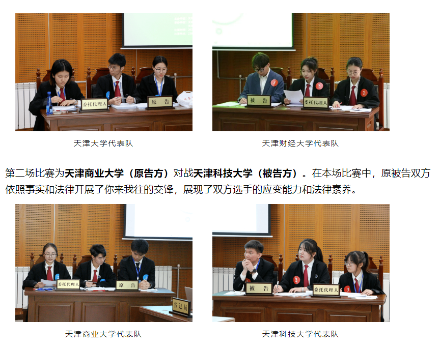 第一场比赛为天津大学(原告方)对战天津财经大学(被告方)。原被告双方围绕案件事实开展举证质证、法庭辩论等环节,气氛紧张,气势十足,充分展示了双方对案件事实的深入研究和出众的庭辩技巧。